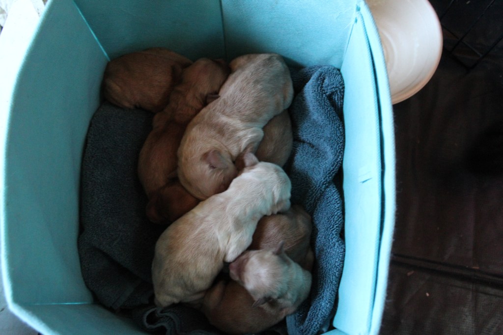 Day old puppies cuddled while mom takes a break and whelping pen cleaned.
